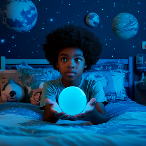 An IMAX-style photo capturing an African-American boy with an afro, sitting up in his bed, holding a small, glowing blue sphere about five inches across, just barely floating above his hands. The boy’s expression is a mix of surprise, happiness, and awe as he gazes at the magical, light-blue glowing orb. The camera angle is a unique, slightly overhead shot that’s positioned both above and in front of him, providing a full view of his bedroom while focusing on his wonder-filled face and the floating sphere. The room reflects the boy’s love for space, with wallpaper adorned with stars and galaxies, creating an interstellar atmosphere. He sits on a bed covered with a blue comforter decorated with various rocket ships and planets, adding to the cosmic theme. Around the room, details like small astronaut figurines, posters of planets, and glow-in-the-dark stars on the ceiling add depth to his space-inspired world. The lighting is soft but highlights the gentle glow of the sphere, casting a faint blue light on his hands and face. The photo is captured in IMAX quality, with an ultra-clear, wide view but framed in a 9:16 aspect ratio to immerse the viewer in the scene. The vibrant blues and magical ambiance create a warm, dreamlike moment as the boy experiences a sense of wonder and excitement in his own cosmic-themed sanctuary.