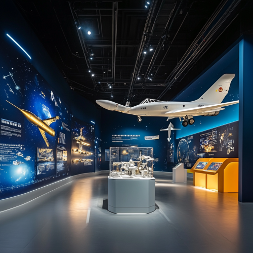 Design an exhibition hall with the theme of flight, aviation and aerospace. The main purpose of the space is to show the development of China's aerospace industry from ancient times to the present day, with special emphasis on China's aviation history, and to define the functions of the exhibition area, interactive experience area, viewing area and rest area. The wall is the core of the room, which is used to display space-related exhibits, such as wooden kites of ancient China, kites of ancient China, paper lanterns of ancient China, gunpowder rockets of ancient China, combat aircraft of the Republic of China, rocket models, satellite models, space suits, space helmets, etc. The interactive experience area is divided into different stages in historical chronological order, with interactive equipment and experiences such as simulated glide flights, simulated hot air balloon ascent, and modern spacewalks. The colors are mainly blue and white, blue represents the sky and the universe, white represents technology and the future, and these two colors can well reflect the theme of Chinese space. At the same time, it can be appropriately matched with some gold, silver and other metal colors to increase the sense of science and technology and modern sense of the exhibition hall. Exhibit display and display are divided into physical exhibits, graphic display boards, multimedia display, physical exhibits collection and display of Chinese space exhibits, such as ancient flight exploration related exhibits, aircraft, rocket models, space suits, space food, etc. ar16:9 manuscript v6.1 q1.5 v6.1 --v 6.1