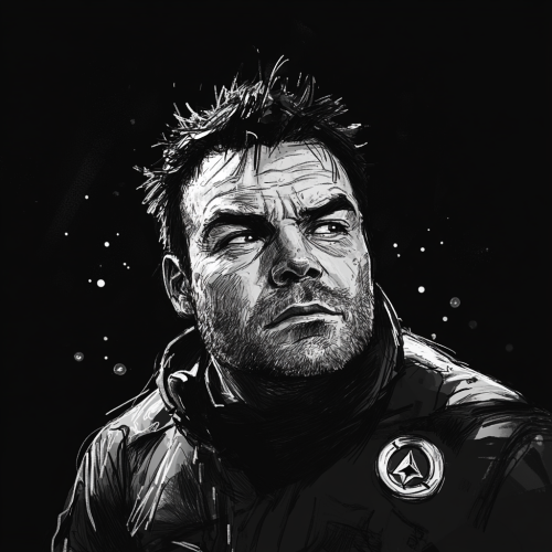 sketched portrait of an adult man with shaved messy slightly receding hair, chubby, looks like Liev Schreiber, wearing a 90s boiler suit with a meteor symbol logo on it, aged in his 30s, tired eyes, clothing inspired by the clothing from the Alien movie franchise, sci-fi, on a black background in the style of John Berkey illustrations, small dots of dull sci-fi light and stars in the background, dark space, black and white, --v 6.1