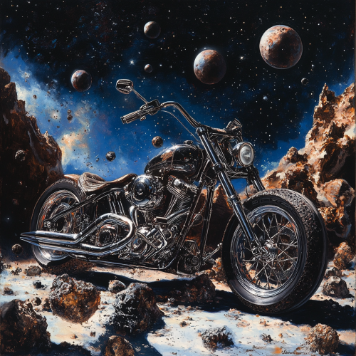 a Harley Davidson Chopper in floating space , surrounded by meteors and planets, in the background there is an old Harley Davidson engine, a surrealistic painting with black outlines, from dark, dark fantasy, it has a dark blue gradient sky, there should be mountains of earth that turned into dust, hyper realistic - - v6.1