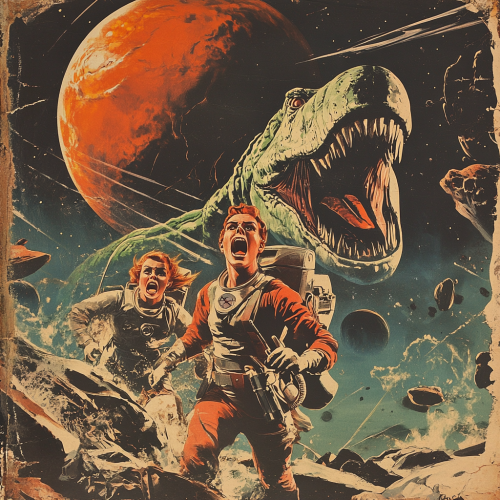 a distressed 1950s style movie poster. It is space themed. There are two terrified humans in space attire. The planet Venus is in the background. There is a creature with a humanoid body and the head of an alligator