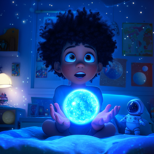 A beautifully animated Pixar-style scene of an African-American boy with an afro, sitting up in his bed, holding a small, glowing blue sphere about five inches across, floating just above his hands. The boy’s expression shows a mix of surprise, happiness, and awe as he gazes at the magical, light-blue glowing orb. The camera angle is positioned slightly above and in front, capturing the full view of his room while focusing on his wonder-filled face and the gently floating sphere. The bedroom is filled with rich, vibrant colors in true Pixar animation style, with soft, rounded edges and a warm, slightly exaggerated color palette. The walls are adorned with starry wallpaper that sparkles faintly, creating an enchanting cosmic backdrop. The bedspread is a deep blue with playful, animated rocket ships and planets, enhancing the space theme. Around the room, small details like cartoon-style astronaut figurines, posters of planets, and glow-in-the-dark stars add to the magical, childlike atmosphere. The lighting in the scene highlights the gentle glow of the sphere, casting a soft blue light on the boy’s animated face and hands, creating a dreamy, cinematic quality. The image is framed in IMAX quality with a 9:16 aspect ratio, capturing the vibrant and magical ambiance typical of Pixar films, as the boy experiences a moment of pure joy and wonder in his own cosmic-themed room.