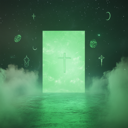 A white, filled silhouette of a person with broad shoulders, arms outstretched, and head tilted upwards, appearing to ascend gracefully against a dark background. The figure looks powerful and majestic as they rise, with radiant beams of light shooting upward from their head, creating a sense of transcendence and energy. The strong contrasts and sharp lines evoke a bold, graphic style, with the figure standing out vividly in the dark, as if they are lifting off into the sky.