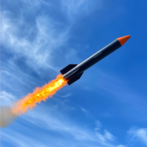 thin black model rocket with a plume of orange fire behind it flying through a blue sky. the rocket is currently breaking mach 1 and going supersonic, so it is surrounded by the vapor cone of the shockwave