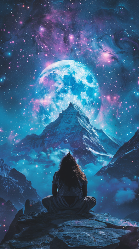 depict in a realistic space 40 million years, wide angle, mount kailash takes the shape of shiva meditating, mount kailasa takes a shape of shiva, twilight in the void, surrounded by stars and galaxies, his body glowing with celestial energy. Snow-capped mountains surround him, while his body glows softly in the moonlight, celestial energy --ar 9:16 --s 250 --v 6.0