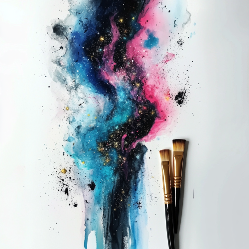 galaxy colours and nebula blend around with a smattering of stars, space material in blues, pinks, teals and black contained within a watercolor streak, thrown from left to right on a vertical surface. A few concentrated areas of the eatercolour streak drip down the surface