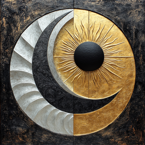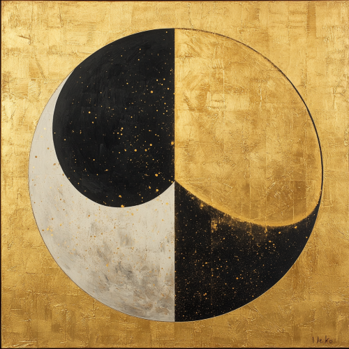 half sun half moon circle, eclipse artwork symbolizing the image that brings the sun and the moon together, gold and silver tones, dark tones, sun and moon, gold tones, flowing gold paint from the sun, full black moon and gold sun, gold circle inside of full moon black circle, flowing gold paint from gold circle, symmetrical compositions, symmetrical painting, gold background, surrounded by sparkling stars, soft