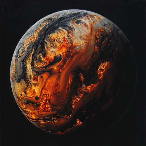 A new planet as seen from space, a fiery planet, no water, volcanoes, canyons, color pallatte is lava red and black, rivers of lava can be seen,smoke, thick smoke atmosphere, black backround