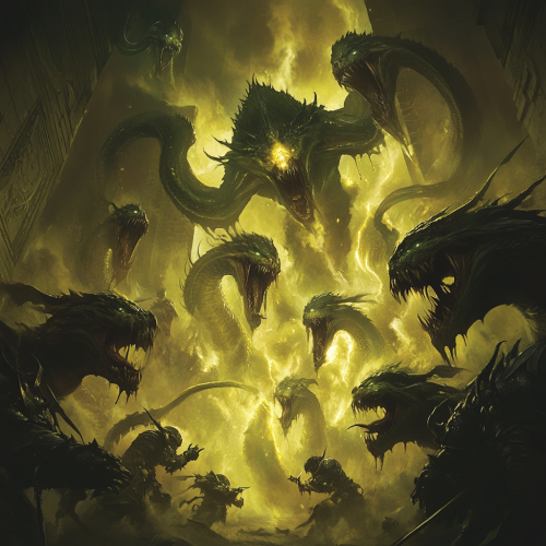 An elite force known as the Legion of Medusa, stands fearlessly against a massive, roiling abyss of dark energy, their fierce serpent heads glowing with potent, high-vibrational power. Their scales pulse with intense, radiant energy, forging a nearly impenetrable barrier that obliterates all malevolent forces attempting to breach it. Each Medusa servitor radiates a lethal grace, their stances unwavering, exuding pure, unstoppable fiery intense aggression. They unleash torrents of quantum-charged fiery golden light, rippling from their hands in waves that transform shadows into mere remnants of inert energy. The atmosphere brims with electric intensity as beams of celestial light cut through the darkness, highlighting every powerful figure with dramatic, radiant illumination. Unmatched in their ferocity, this formidable legion is the universe's most dominant force of attack and protection, leaving no shadow unturned and no threat undeterred.