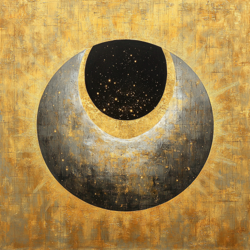 eclipse artwork symbolizing the image that brings the sun and the moon together, gold and silver tones, dark tones, sun and moon, gold tones, flowing gold paint from the sun, full black moon and gold sun, gold circle inside of full moon black circle, flowing gold paint from gold circle, symmetrical compositions, symmetrical painting, gold background, surrounded by sparkling stars, soft