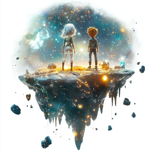 3d modern futuristic illustration in cartoon Pixar style on white background, png , Hight resolution, hight detailed texture. A floating island in space surrounded by glowing stars and nebulae. Two children stand on the island--Luna, a silver-haired girl with glowing skin, and Sol, a boy with hair like golden rays of the sun. They look determined, staring into the vast, sparkling universe. The stars have curious, expressive faces, twinkling like they’re alive. The island is covered in shimmering stardust and floating crystals.