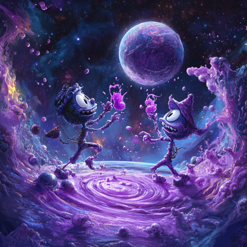 2 badass cartoon characters, one slightly bigger than the other, throwing purple juice towards a planet in space, hyper realistic liquid jelly surrounds them in a galaxy