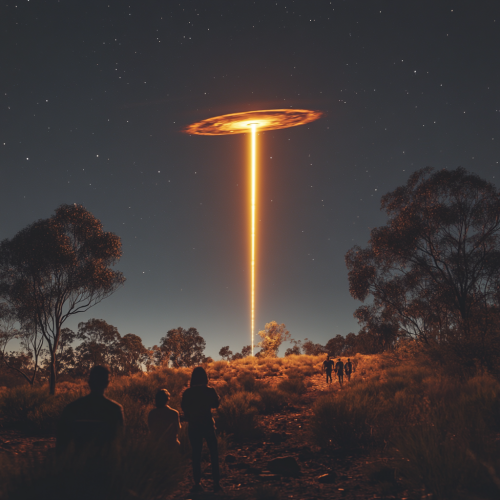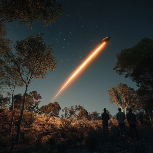 a weird looking UFO like object leaving a fire like streak across a clear night sky in the Australian bush with shocked onlookers in the foreground, photorealistic 4k