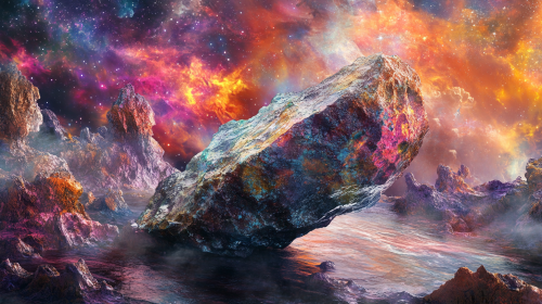 A highly detailed, high-resolution illustration and showcasing a DHOFAR 019 Martian Meteorite - with intricate details and vibrant colors symbolizing the undiscovered meteorite - The scene includes elements from another planet to represent high vibration. The composition is dynamic and engaging, showcasing the blend of meteorite --ar 16:9