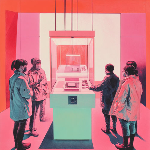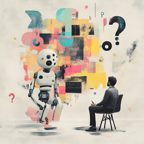 Generate a digital art for Digital art of a tech interview scene where the candidate, looking disinterested, responds with 'Nope, I'm good' when asked if they have any questions. The background is light gray. The interviewer appears puzzled and slightly disappointed, highlighting the candidate's lack of curiosity. --ar 4:3 --quality .5