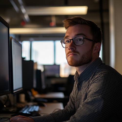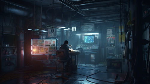 Generate a digital art for A digital art scene depicting a programmer working on a computer screen filled with code. The screen shows numbers from 1 to 100, with multiples of 3 highlighted in a distinct manner as 'Fizz', multiples of 5 as 'Buzz', and multiples of both 3 and 5 as 'FizzBuzz'. The background is dark, using black color to emphasize the glowing text on the screen. The atmosphere should reflect concentration and problem-solving, with elements of loops and conditionals subtly integrated into the design. --ar 12:5 --quality .5