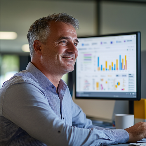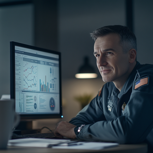 A 50-year-old European man is happily sitting in front of his PC, focused on the screen where a Teams meeting is taking place. He looks directly on the monitor. He is wearing a pilot uniform and has short, dark hair. On the PC screen, a graphic is displayed, visualizing data. The room is well-lit, with a desk that has some notes and a cup of coffee. The atmosphere is positive and productive, with a touch of creativity. Very realistic. --v 6.1