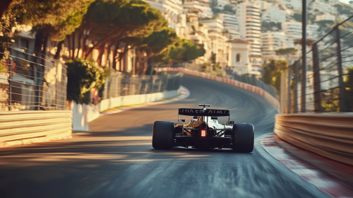 ultra high resolution cinematic image of a formula 1 car speeding around a bend on a city track. The image shot low with the car centred in frame. Shot on a Hasselblad medium format camera with a 100mm lens --ar 16:9 --style raw --stylize 200 --v 6.1