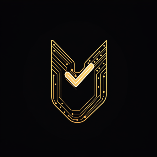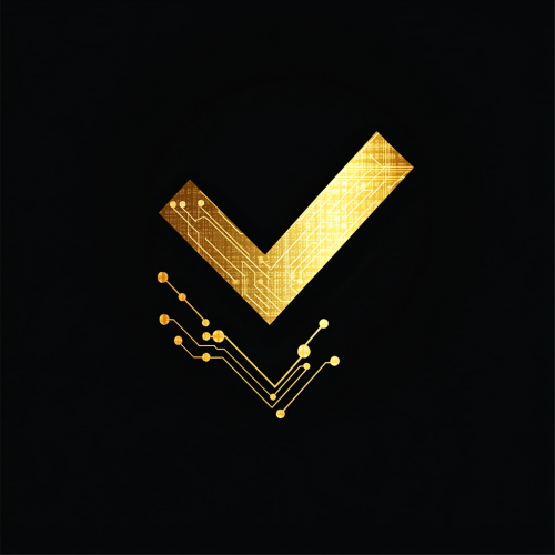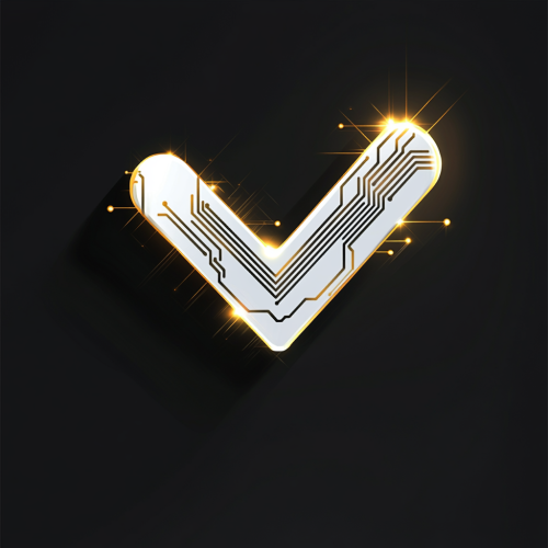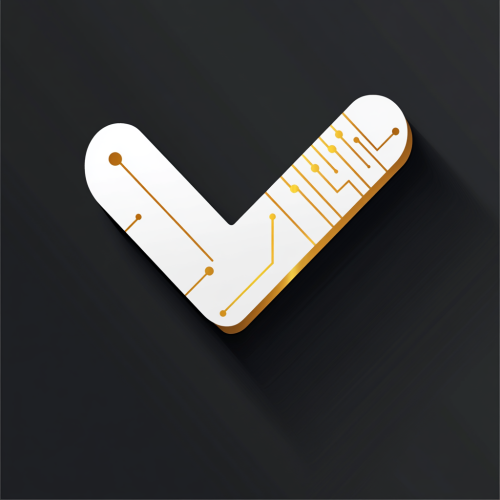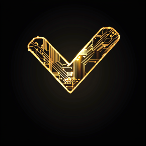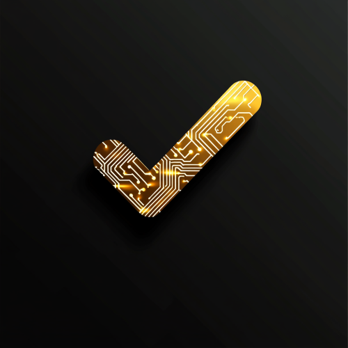 A simple, flat, clipart-style check mark in white and gold with simple circuit pattern across its surface. No shadows, no gradients, no reflections, and no lighting effects. Positioned on a solid black background with clean, sharp edges for a clear, minimal design.
