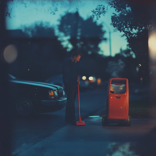 blurry image of a happy man next to a car during a nice summer day. In the fokus of the image is a red vacuum cleaner. The overlay of this image is dark blue. There are vibrant light on the right frame side