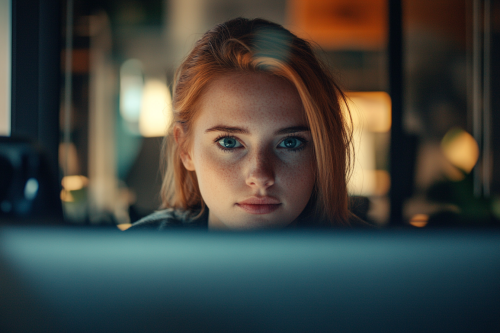 Generate a digital art for Digital art of a professional researching a company's culture. The scene includes a person sitting at a desk with a computer, surrounded by documents, employee reviews, and news articles. The background should reflect a modern office environment. Use light gray as the primary color. --ar 2:1 --quality .5