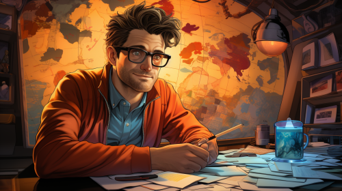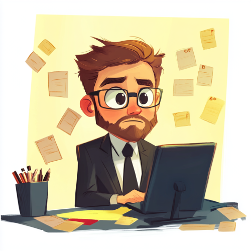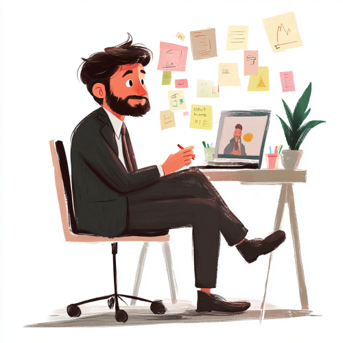 illustration of a cute small male designer in suits siting on a video call and taking designs feedback.....sticky notes aound him..whote background, dramatic,