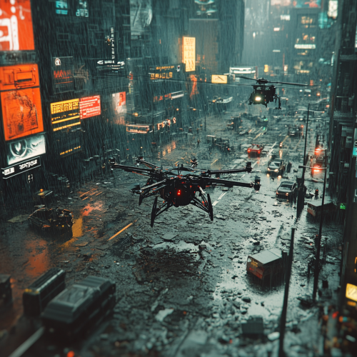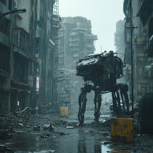a cyberpunk megatropolis, immediately after a violent year long war, pouring rain, dog sized walker robot drones survey the damage and wreckage of the scenery, professional cinematic documentary photography
