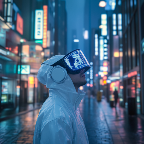Un homme blanc ayant une middle part regardant en haut a droite, portant une veste futuriste et un casque de réalité virtuelle, entouré de lumière néon bleue et verte en majorité , et un fond avec un peu de brume avec une ville au japon éluminer avec des led en flou. Un portrait en pied, surréaliste et hyperréaliste, dans un style esthétique cyberpunk photographique. L'image est hyperréaliste, rendue avec Octane, haute résolution, étalonnage professionnel des couleurs, ombres douces, contraste minimal. --ar 1:1