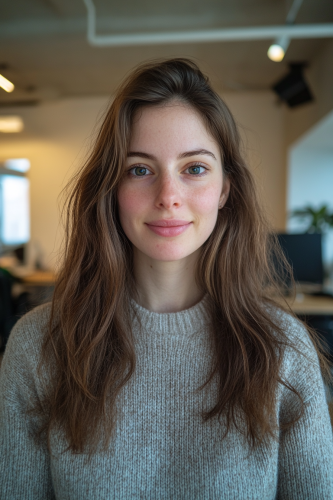 front facing photo of someone working from their office. The perspective should look like it's coming from a webcam in a video chat. realistic image. normal looking person. --ar 3:2