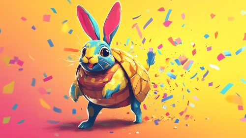 The tortoise and the hare reimagined: developer tortoise meticulously writing documentation vs AI hare already crossing multiple finish lines with confetti, playful illustration style, bright colors, funny expressions --ar 16:9