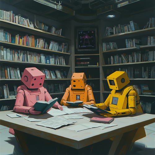 realistic image in simon stalenhag style of a triangular table with three mutely coloured androids sitting around it, one circular head pink android is reading a book titled history of ai, one square head yellow android is writing on paper and the other thin orange android is closing a book after reading, the books on the shelves have titles related to artificial intelligence