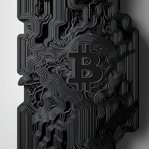 A black and white vector design for laser engraving on a black anodized metal stand, combining themes of blockchain technology, Bitcoin, and natural, earthy elements. Imagery should include intricate circuit-like patterns resembling tree roots or branching networks, with subtle, stylized Bitcoin logos integrated into the design. The artwork should evoke a sense of organic growth and inevitability, with smooth lines flowing like veins in leaves or river deltas. The style should be highly detailed yet clean, with high contrast for laser engraving, ensuring a clear and striking black and white design suitable for vector formatting