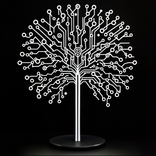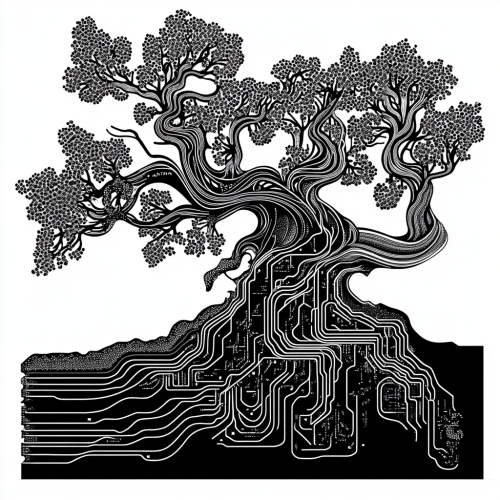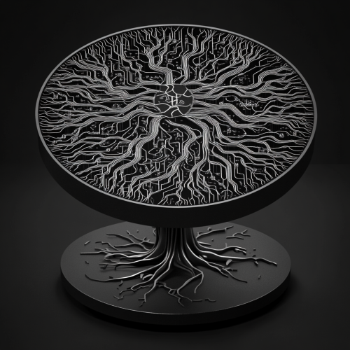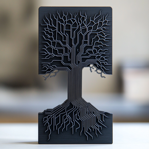 A laser-engraved design for a black anodized metal stand, combining themes of blockchain technology with natural, earthy elements. Imagery should include intricate circuit patterns resembling tree roots or branching networks. The design should evoke a sense of inevitability and organic growth, with smooth lines flowing naturally like veins in leaves or river deltas. The artwork should be a harmonious blend of technological precision and the beauty of nature, suitable for laser engraving with fine, clean details and a sleek aesthetic