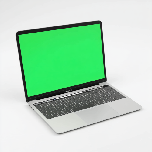 M4 MacBook Air facing the camera on a white background, high-quality mock-up with a bright green screen visible on the laptop, no reflections, no additional visuals, no text, strictly no light reflection, Sleek design, smaller bezels, large trackpad