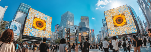 A photo of the Shibuya Crossing in Tokyo, Japan, with large QR code digital billboards displaying sunflower patterns and Japanese advertising. The buildings have modern architecture. A crowd is walking through the crossing. It's a sunny day with a blue sky. --ar 112:39