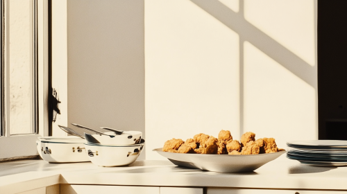 Advertizing photography, chicken nuggets, close-up shot, Canon EOS R5, ambient light, modern setting, indoor, sunny weather, serene mood, Stanley Kubrick style, 2020s, #EAEAEA --ar 16:9 --style raw --s 50 --sref 2482