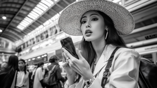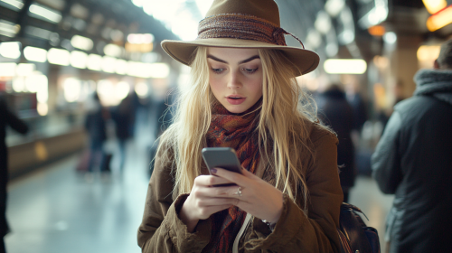 a fashionable 26 year old woman looking at her iphone, she is confused and baffled, she is in London Paddington station, shot by steve ketner --ar 16:9