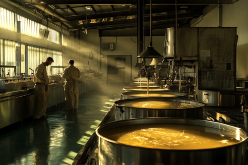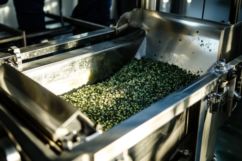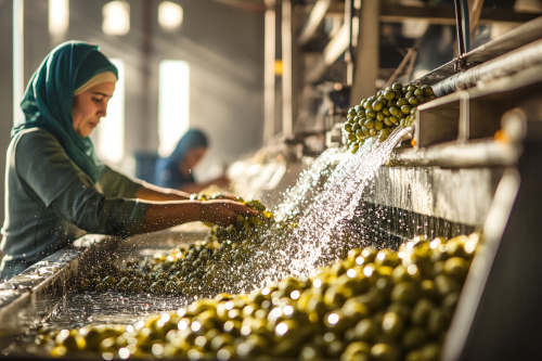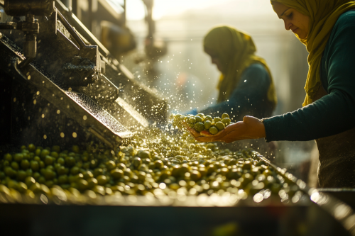 A close-up shot of a modern olive crusher, where female workers in hijabs feed washed olives into the machine. The powerful machinery is highlighted, showing the olives being crushed into a rich, green paste. The scene captures the workers' expressions of concentration and teamwork, with warm sunlight illuminating the area and casting dynamic shadows across the floor. This visual emphasizes the transformation of olives into oil, showcasing the innovative technology used in the process. --ar 3:2 --v 6.1