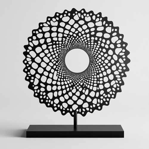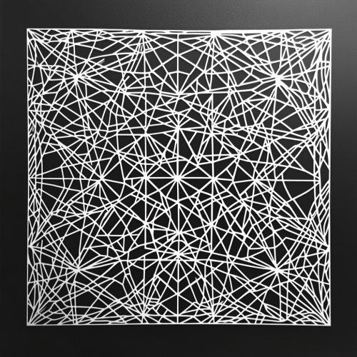 A black and white vector design for laser engraving on a black anodized metal stand, inspired by the concept of emergence and complexity. The artwork should feature a network of abstract geometric forms, starting from a central core and expanding outward into intricate patterns, like a digital galaxy or a technological fractal. The design should suggest growth, interconnectedness, and hidden order, with subtle references to blockchain technology through interlocking hexagons and nodal connections. The Bitcoin logo should be subtly embedded within the network, appearing as a natural part of the growing structure. The style should be highly detailed but balanced with clean negative space, maintaining a high-contrast look perfect for laser engraving, and formatted as a vector to ensure precision and clarity