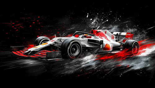 an artistic image of a formula 1 car speeding across from left to right, use colors black, red, white, the left part of the image shold be black so the car emerges from a black space --ar 7:4