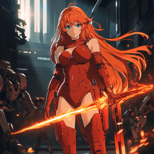 A beautiful, long-haired female warrior with vibrant red hair and blue eyes, dressed in a red strappy outfit, stands with her hair flowing in the wind. She holds a sword emitting an orange-red glow, fiercely facing off against multiple mechanical enemies. The warrior gazes forward in a battle stance, with flickering flames on the sword, adding dynamic energy and emphasizing the blade's power. The background is a 3d game style spaceship or corridor, scattered with various menacing robots, enhancing the tense, video-game-like atmosphere of this intense battle scene.