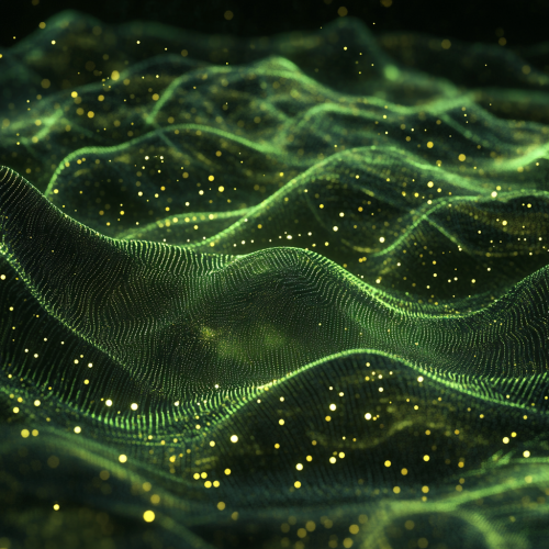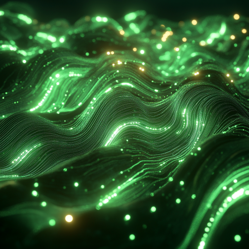 A highly detailed, photorealistic digital image of a glowing green neural network or digital wave. The scene features wavy, interconnected lines and dots that form an abstract 3D grid with an undulating, wave-like structure. Each line is embedded with small green particles that glow softly, creating a dynamic, high-tech aesthetic. The lines and points of light flow smoothly across the frame, with a subtle depth of field (DOF) effect, where the foreground is sharp, while parts of the background are softly blurred. The overall style is futuristic, evoking the look of artificial intelligence, data flow, and advanced digital networks. The background is dark to make the green particles and lines stand out vibrantly, adding a sense of depth and immersion