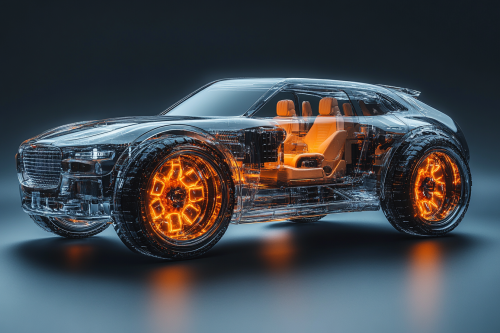 Hyper-realistic Redshift render of a family SUV with a transparent, glass-like body, exposing the wheels and internal machinery. Only the seats, dashboard, and steering wheel remain opaque, crafted from dark, luxurious materials --v 6.1 --s 750 --ar 3:2