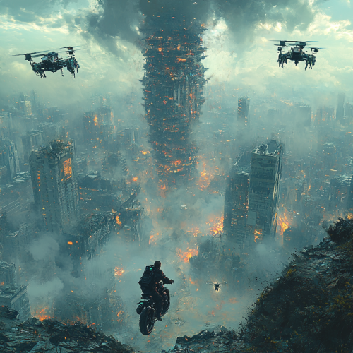 a man on a hoverbike chased by two drones through the wasteland. A big city connected to the sky in the distance. The sky is clouded and ripped apart by neon light. --s 250