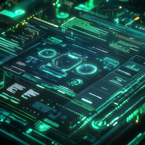 a user interface in a computer in light green and blue tones, with holographic icons, a secure layout, and organized data streams, conveying data protection, minimalism, and an advanced, technology-driven atmosphere