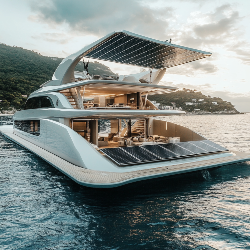 solar panels on a super yacht. They are supported by a self standing carbon fibre structure that cantilevers out above the water. They can be folded and retracted inside the boat.