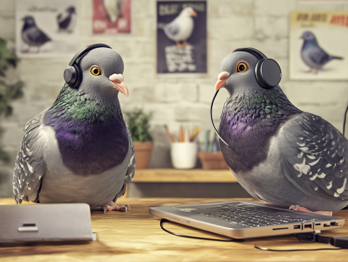 A pigeon with a headset on, sitting at a small desk with a laptop, speaking to another pigeon through a phone. Soft office background with small bird posters. --ar 4:3