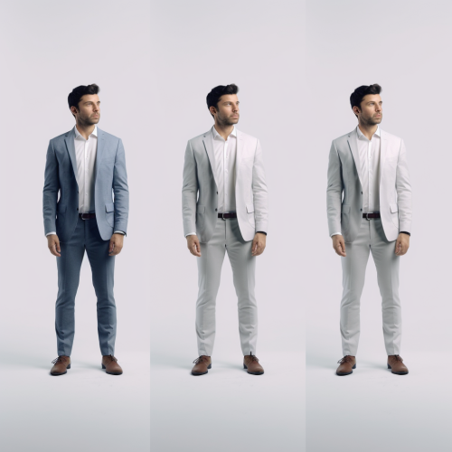 enerate three views, firstly the front view, secondly the left view, thirdly the back view, full body, Sly male in suit, bored pose, standing, clean background, pop mart, Studio light, octane render, 3D, C4D, blender, hyper quality, Ultra HD, 8K --v 5.1
