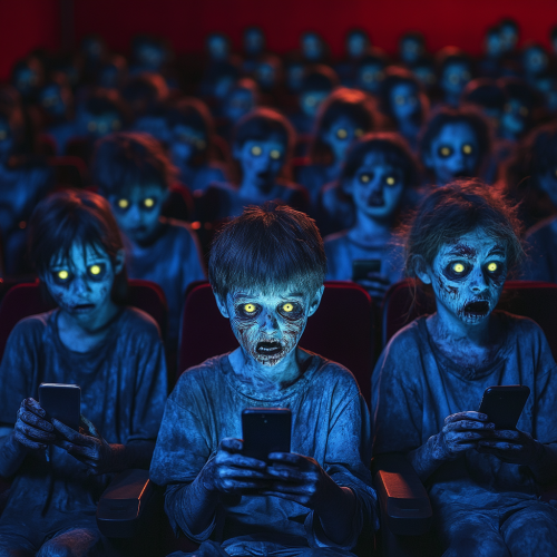 many rows of zombie children blueish rotting skin yellow eyes looking down at their cell phones sitting in a dark theater, illumination from the phones, surreal --style raw --v 6.1 --s 250