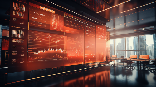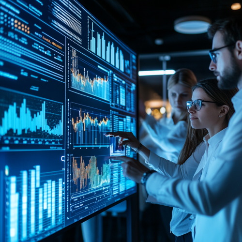 AI-powered analytics in business setting, team of professionals analyzing financial data, advanced data visualizations, smart graphs and algorithms on large touchscreens, high-tech office